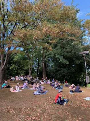 古民家の見学を終えて、広場でお弁当を食べました。同じ方向を向いて黙食です。木が色づき始めています。秋です。