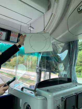 バスの中では静かにレクをしています。バスガイドさんの問題をじっくりと考えています。
