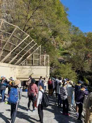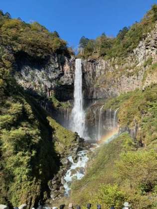 華厳の滝を見学しました。雲一つない青空のもとで、立派な滝が見られました。