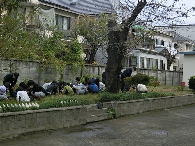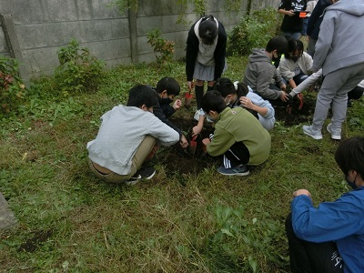 給食室近くの花壇をスコップで掘って、土の色の違いや