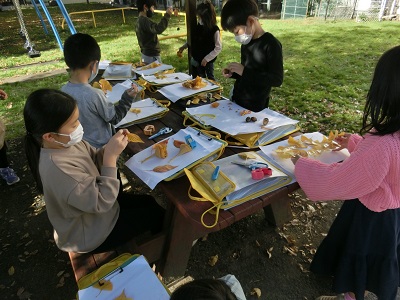 子どもたちは、イチョウの葉で花を作ったり