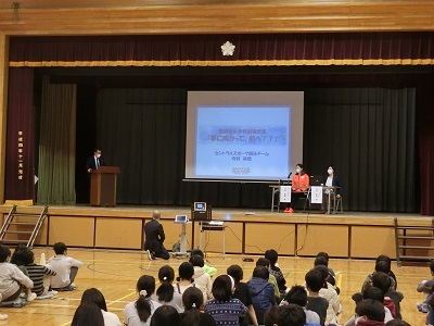 6年生は体育館、他の学年はリモートでつなぎ、各クラスにて聴講しました。