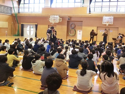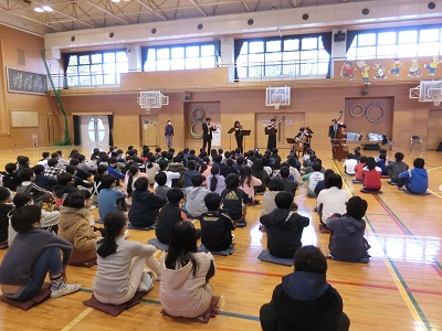今年度は、東京フィルハーモニー交響楽団の弦楽五重奏のみなさんを学校にお招きしました。5年生が体育館で音楽鑑賞をしました。