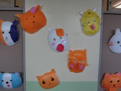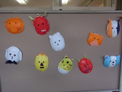 2年生の図画工作「かぶってへんしん」が廊下に貼り出されています。