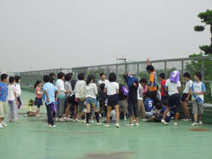 異なる学年のクラスごとに集まり、校庭・体育館・屋上で楽しく遊びました。