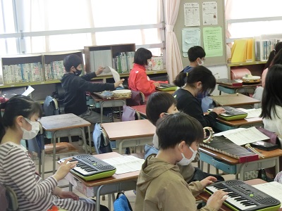 楽譜を見ながら、自分の担当の楽器を演奏しました。