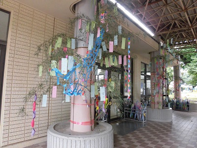 ピロティの柱につけられた笹の葉には、子どもたちが書いたたんざくが揺れています。5年生は英語で願い事を書きました。将来の夢、うまくなりたい習い事、欲しいもの…。スペルが難しかったり、言葉が思いつかなかったりしましたが、がんばって書きました。1年生は、ひらがなでお願いを書きました。