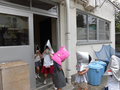 防災頭巾をかぶり「お か し も」の約束を守って落ち着いて校庭に集合することができました。初めて見る防火シャッターに戸惑いながらも、上手に避難できました。