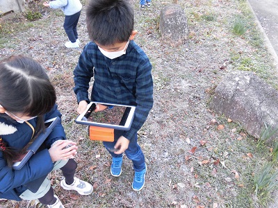 給食室横の花壇(学校の裏側)で霜柱を観察しました。