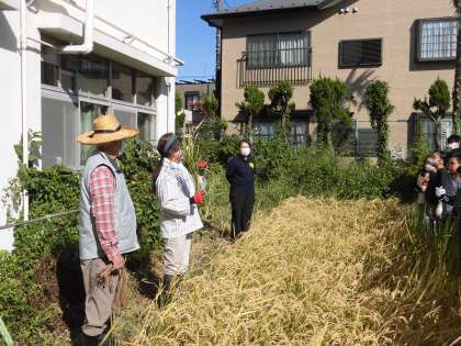 刈り取りの手順を川本さんに教わって田んぼに入りました。