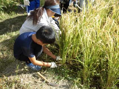 しっかりと稲を握り、おそるおそる鎌を使い刈り取ります。