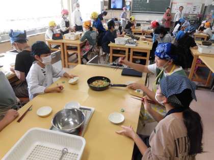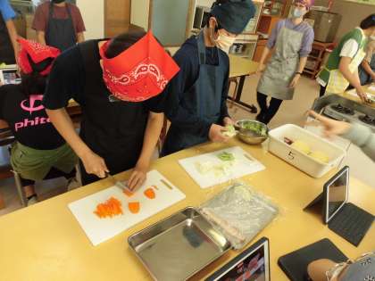 包丁の持ち方を確認し、切り方のお手本は、タブレットで動画を見ました。