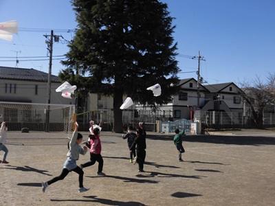 友達と糸がからなまいように、一列に並んで凧揚げを楽しみました。