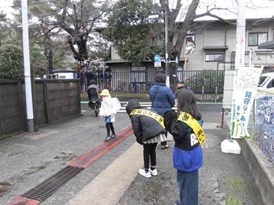PTA保護者の方、地域の方々、祖師谷子ども健全育成の会の方々にご協力いただきました。通学路や西門・正門で見守りとあいさつ運動です。