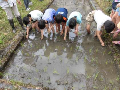 お米ができるまでの学習です。田植えから始まって稲刈り、脱穀まで行う予定です。
