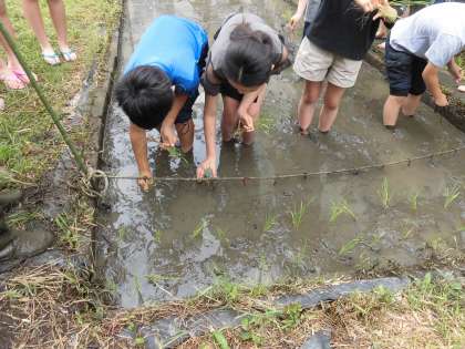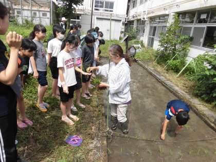 田んぼに素足で入った瞬間、泥の感触にびっくりしていた5年生。