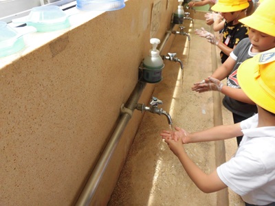 スタンプのあとが消えるまで、せっけんでしっかりと手洗いをします。