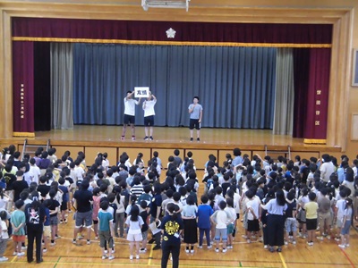 最後に、看護当番の先生が今週の目標「どこでも落ち着いて過ごそう」を確認しました。気持ちがザワザワしている時には、深呼吸をすると気分が落ちつきます。実践してみてほしいです。