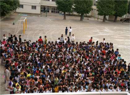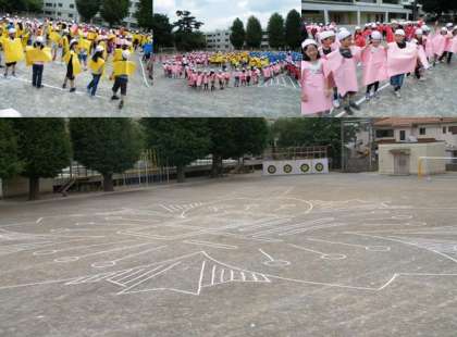 それぞれ決まった色のカラーエプロンを着用し、校庭に描かれた校章の形に沿って並びました。