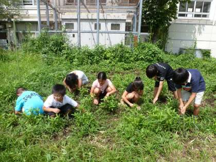 4年生は、藍とヘチマが大きく育つように、夏休み中も分担して水やりや草とりを行っています。