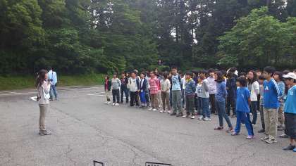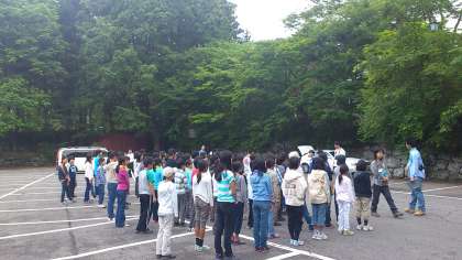 天気は曇っていますが、近くの駐車場で朝会を行いました。