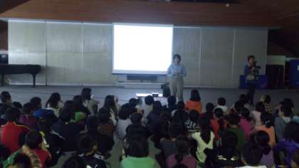 まずは、広場で動物の画像を見ながらお話を聞きました。