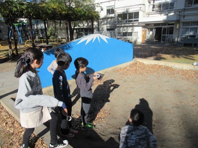 黒い紙と虫めがねを用意して、日当たりの良い場所で紙の上に虫めがねをかざします。光の集まり方が最も強くなる位置を見付けたら、そのままキープ。あっという間に白い煙があがり、紙に穴があきました。焦点の実験成功です。太陽の光を上手に集めると高温になることがよくわかりました。