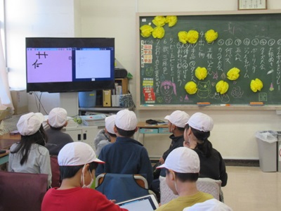 「漢字書き取りリレー」では、赤組と白組に分かれて先生が出したお題をどちらがより早く漢字で書けるかを競います。漢字を書く道具はタブレットです。1人が最初の一角を書いたら、次の人にタブレットを渡します。勝敗は早さだけでは決まりません。とめ・はねなども正確に書くことも勝敗のカギです。両チームのタブレット画面は大型テレビにリアルタイムで投影されるので、進行具合を全員で見守りながらリレーを楽しみました。