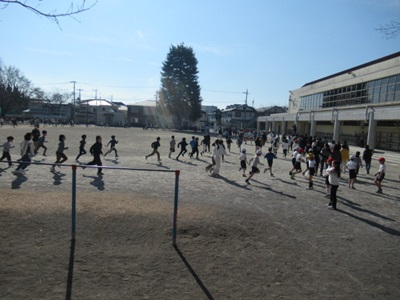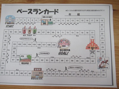 校庭を8周走ると祖師谷大蔵駅、最終ゴールの国立競技場(110周)を目指して、がんばりましょう。