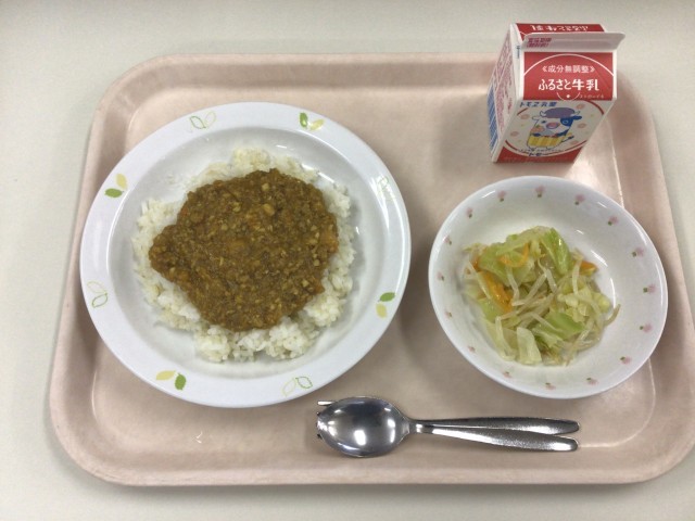 本日のドライカレーライスには、大豆・ひよこ豆・レンズ豆の3種類の豆が入っています。野菜もたっぷり入っていて栄養満点です。サラダもとても美味しくできました。たくさんのクラスから「美味しいです!」という元気な声をたくさん聞くことができました。