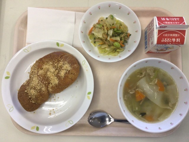 給食のきなこあげパンは、給食室で揚げています。たっぷりの油でパンの表面がカリッとなるまで揚げて、きなこをまぶします。揚げる時間が短すぎても長すぎてもおいしくないのですが、調理師さんがプロの技でとってもおいしく揚げてくださいました。