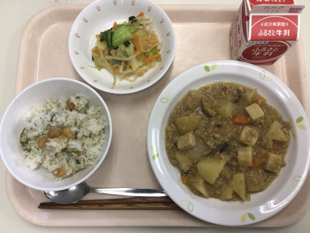 大豆は「畑の肉」と呼ばれるくらい、たんぱく質を多く含んでいます。たんぱく質は、私たちの体の血や肉を作るのに必要な栄養素です。今日は大豆を油で揚げてカリッとさせ、甘辛のタレに漬け込み、ごはん・白ごま・青のりと一緒に混ぜ合わせました。