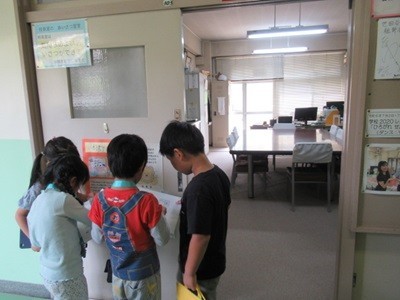 手をつないで教室を出発して、職員室、保健室、図書室などをめぐります。訪問した場所は地図にシールをはっていきました。