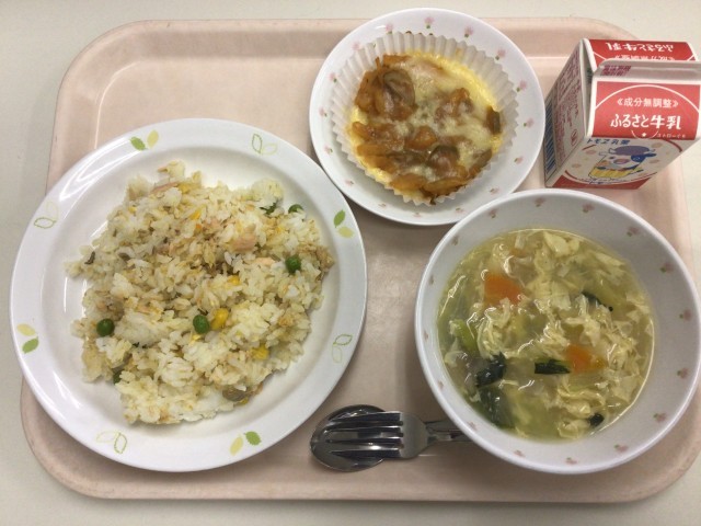 さけピラフのさけは、塩で下味をつけた後、オーブンで一気に焼き上げています。さけが焼けた後は、調理師さんが丁寧に皮から身をはがして、具を作ってくださいました。コーン・玉葱・にんじん・グリンピースも入り、彩豊かなさけピラフができました。