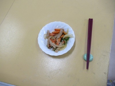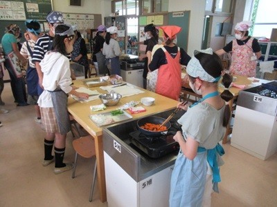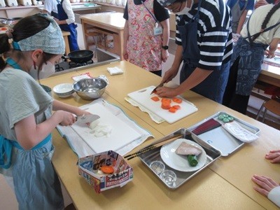 野菜を洗う、切る、炒める、盛り付けまで班の友達と協力しながら、手際よく