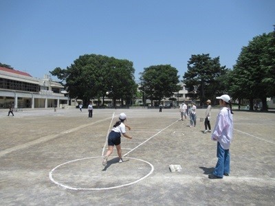 ソフトボール投げでは、5年生の担任の先生がお手本を見せると、