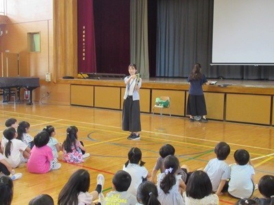 栄養士の先生と担任の先生が、「そらまめくんのベッド」を読みました。