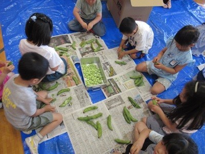 1年生が「そら豆」の皮むきを体験しました。