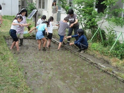 理科園の田んぼに魚沼産コシヒカリの苗を植えます。