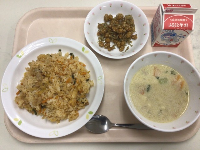 スタミナチャーハンには、にんにく・しょうが・キムチ・豚肉・にらなどが入っています。にんにく・しょうが・にらは、香味野菜といい、料理の香りを良くしてくれます。豚肉とキムチは相性抜群で、栄養素もたくさん入っています。キムチのピリ辛で食欲が増したのか、どのクラスもよく食べていました。