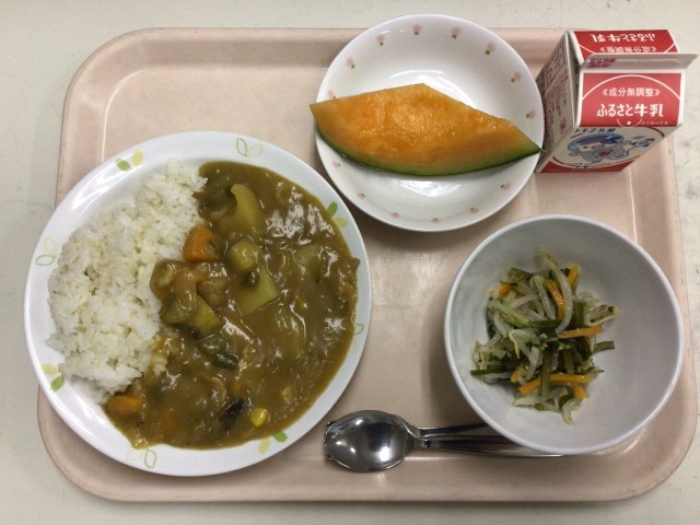 夏野菜とは、夏が旬の野菜のことです。今日のカレーには、夏野菜のなす・とうもろこし・ピーマンを使いました。彩りもよく、栄養満点でおいしいカレーができました。