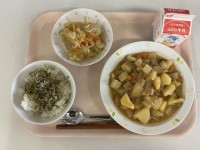 <献立>・ふりかけごはん・じゃがいものそぼろ煮・野菜のからしあえ・牛乳 今日のふ...