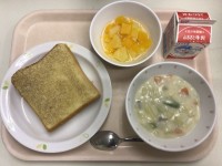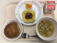 <献立>・黒砂糖パン・ポテトオムレツ・コンソメスープ・くだもの(清見オレンジ)・...
