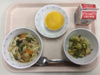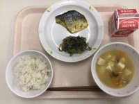 <献立>・麦ごはん(有機米)・魚のカレーしょうゆ焼き・野菜ののり和え・豆腐のみそ...