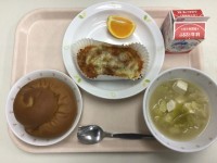 <献立>・黒砂糖パン・ミートグラタン・豆腐入り野菜スープ・清見オレンジ・牛乳 黒...