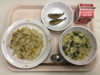 <献立>・鶏チャーハン・こあじのから揚げ・にらたまスープ・牛乳 こあじには、カル...