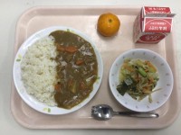<献立>・カレーライス・わかめサラダ・冷凍みかん・牛乳 冷凍みかんは列車に冷房が...