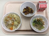 <献立>・豚汁うどん・野菜の梅おかかあえ・大学いも・牛乳 野菜の梅おかかあえは、...