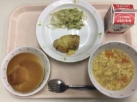 <献立>・ミルクパン・鶏肉のチーズ焼き・グリーンサラダ・ポテトと卵のスープ・牛乳...