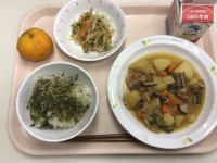 <献立>・ふりかけごはん・肉じゃが・くきわかめの甘酢あえ・冷凍みかん・牛乳 今日...